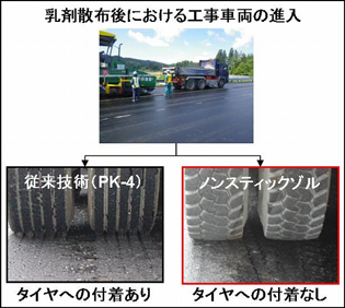 ・付着抑制効果および層間接着力を付加する添加剤を加えたことにより、アスファルト乳剤散布後に進入する工事車両(主にダンプトラック)のタイヤへの乳剤の付着が減少し、層間において安定(均一な)した散布状態が確保されることから層間接着力が向上し、品質が向上する(従来技術は、乳剤散布後に工事車両が進入すると、タイヤへ乳剤が付着してしまう。その結果、乳剤散布量が局所的に不足し、供用性能に悪影響を及ぼす)。また、周辺の既設舗装や構造物を汚さないため、周辺環境への影響を抑制できる。更には、汚れを防ぐ石粉等を散布する必要が無いため、施工性が向上する(従来技術は、乳剤散布後に工事車両が進入すると、乳剤あるいは分解後のアスファルトがタイヤに付着し、周辺の既設舗装や構造物に黒いタイヤ痕がついてしまう。また、それらの汚れを防ぐための石灰等の散布とその清掃が必要。)