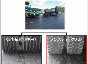 ・使用するアスファルト乳剤の材料として、付着抑制効果および層間接着力を付加する添加剤を加えた。(従来技術は、付着抑制効果および層間接着力を付加する添加剤を加えていない。)