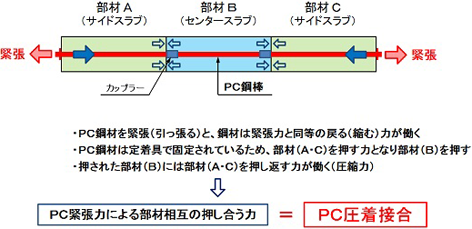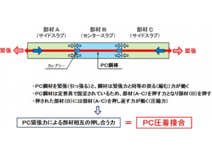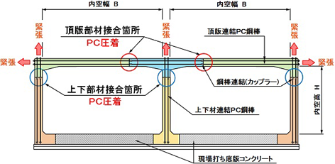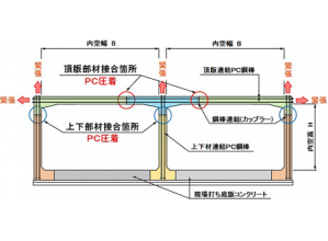 ・PC鋼材の緊張力により圧着接合する「PC圧着工法」を採用した剛結合方式のカルバートである。