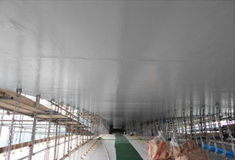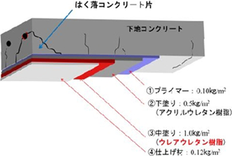 ・中塗り材に硬化被膜が強靭なポリウレアウレタン樹脂を用いることにより、繊維シート接着が不要となった。