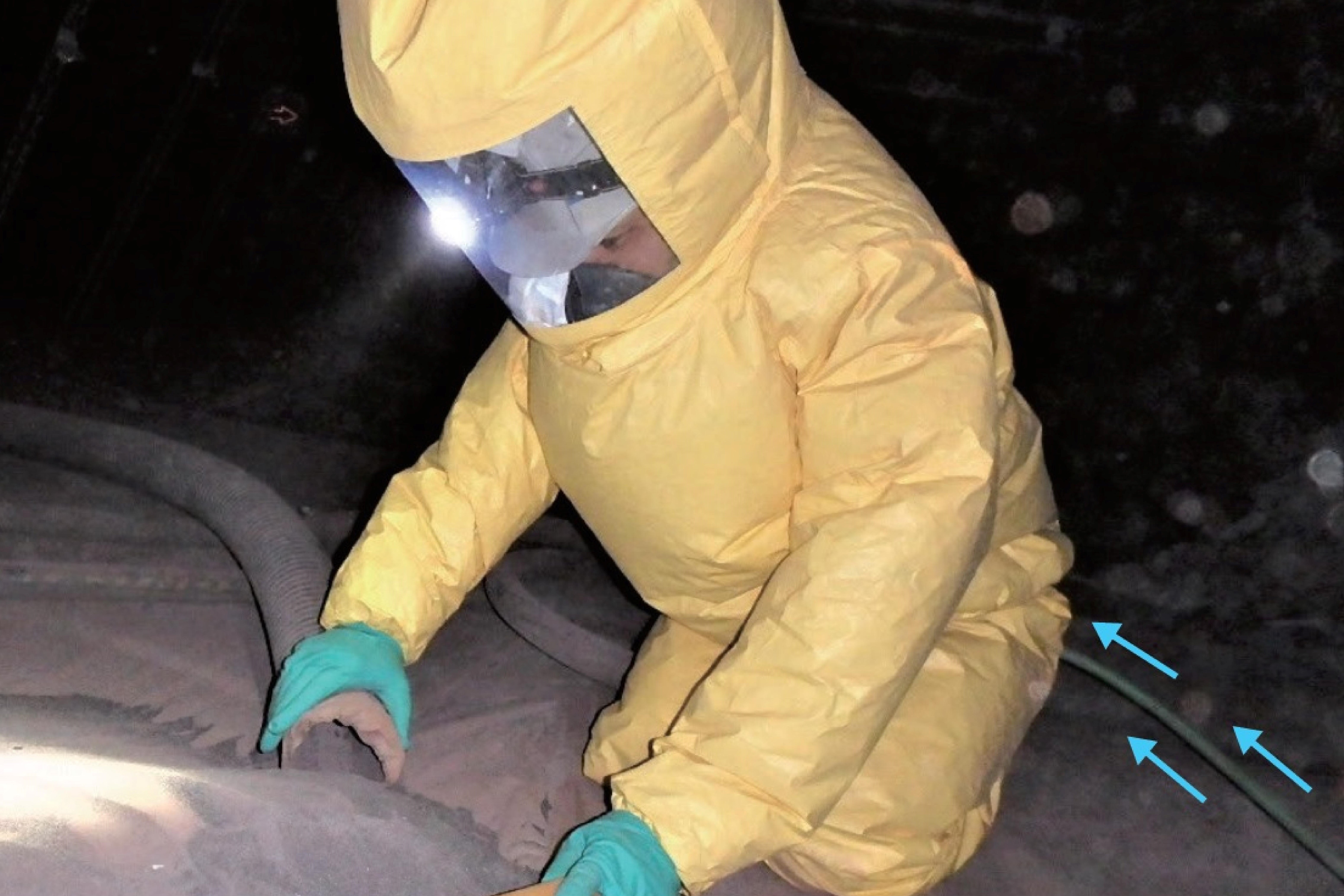 ・全身をすっぽりと覆うスーツにより有害粉じんが体に付着せずより安全性が向上する。