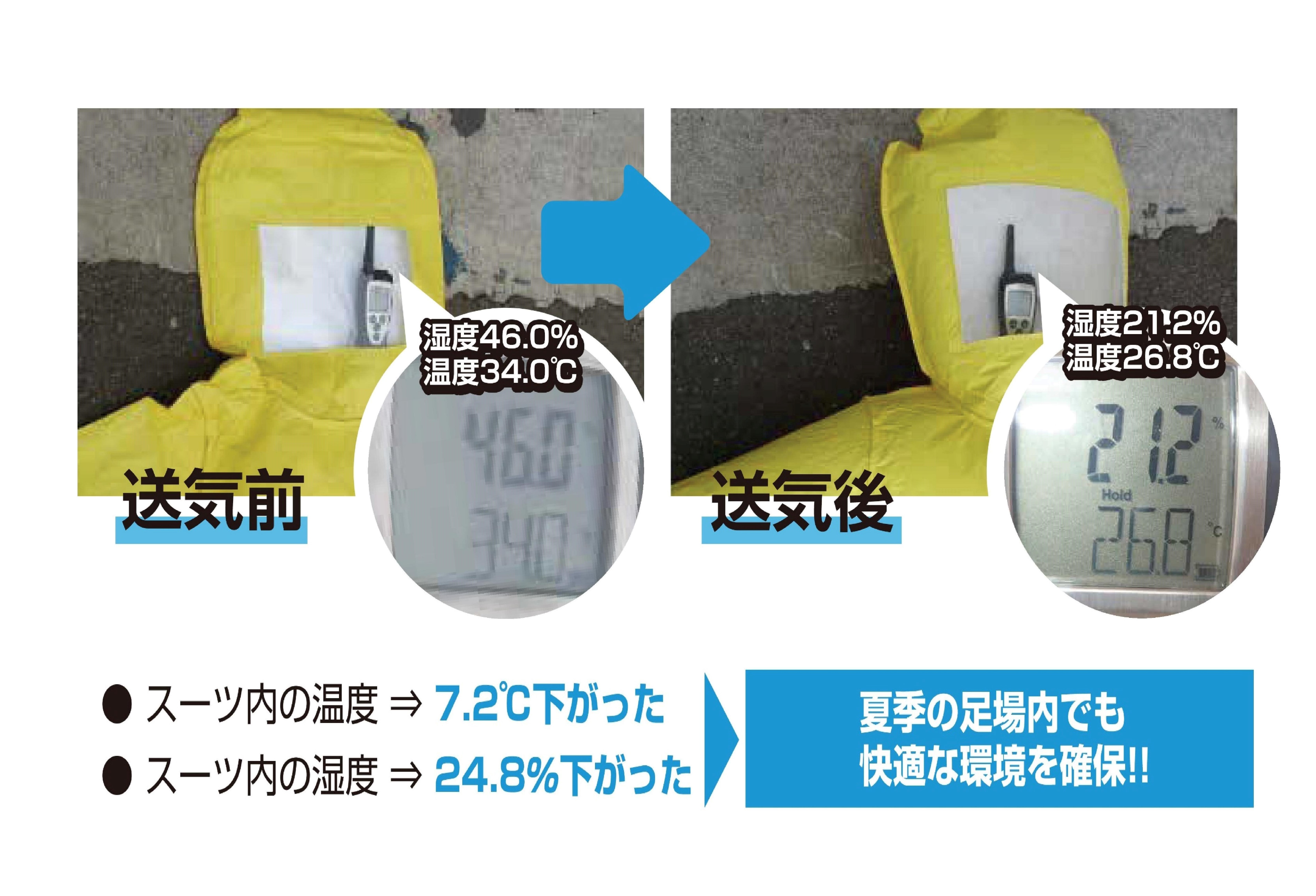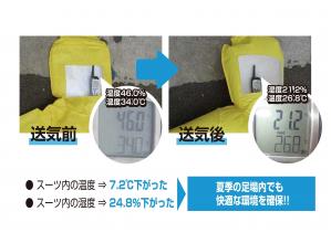 ・エコクリーンクールスーツを着用し、冷気変換装置にエアーを送ることによりスーツ内の温度と湿度を下げ快適な作業空間の確保ができる。