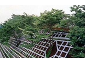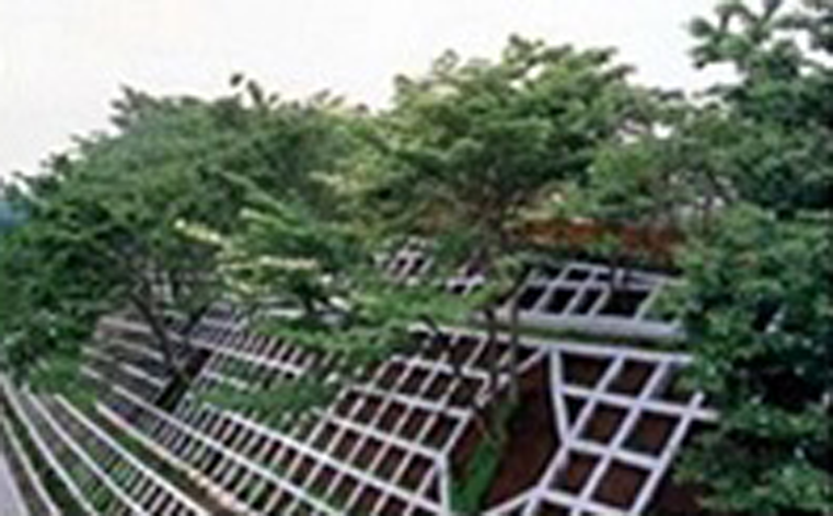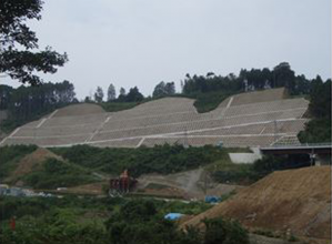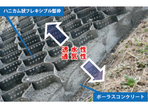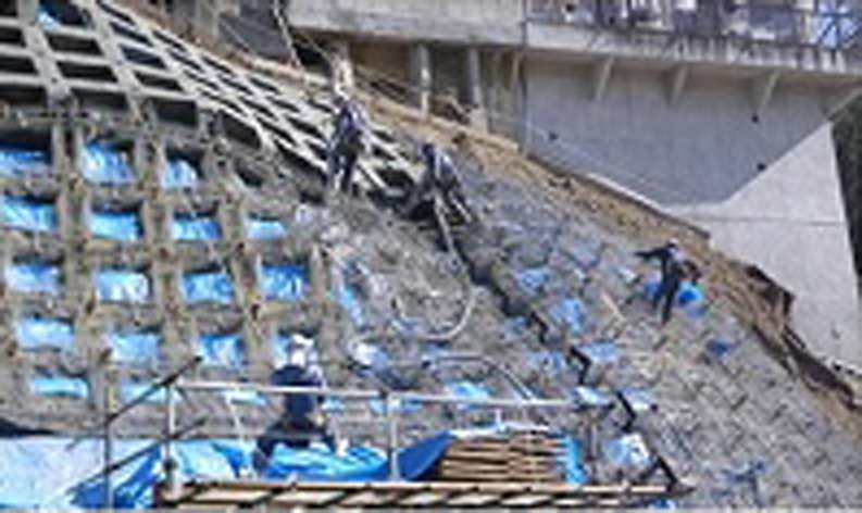 ・砂・セメント・長繊維からなる長繊維混入補強土に変えたことにより、全面緑化が可能となり、周辺景観と調和し周辺環境への影響が抑制される。