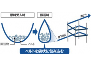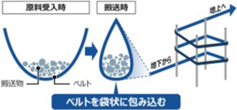 ・従来のベルトコンベヤ(平ベルト)から袋状に包み込む密閉構造に変えた。