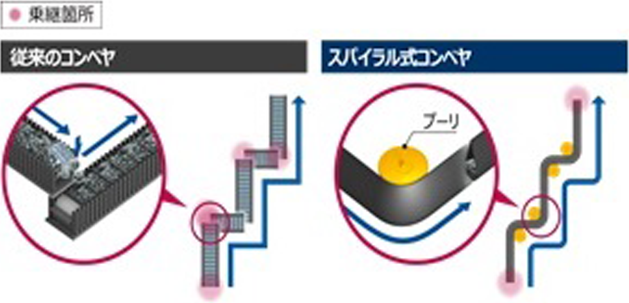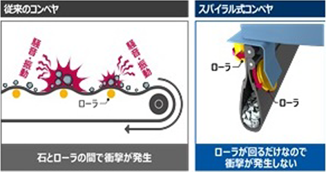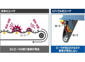 ・従来はベルトコンベヤ(平ベルト)のたるみによるローラと運搬物との衝撃による騒音があったが、本技術はその騒音がない。
