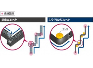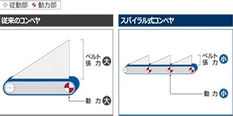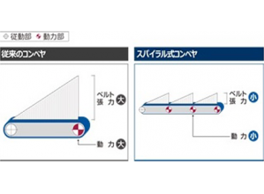 ・吊下げ構造にしたことで搬送物の重力が下に働き、同時にベルトの側面を押す力が発生し、搬送物を保持する力が生れる。そのため、従来技術は傾斜角度が±15°程度であるが、本技術では傾斜角度が±25°程度まで可能となった。