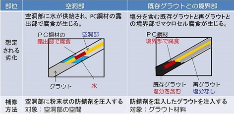 ・防錆剤を混入したKKグラウト注入に変えたことにより、残留塩分に起因するマクロセル腐食を抑制するため、既設PC構造物の耐久性が向上する。