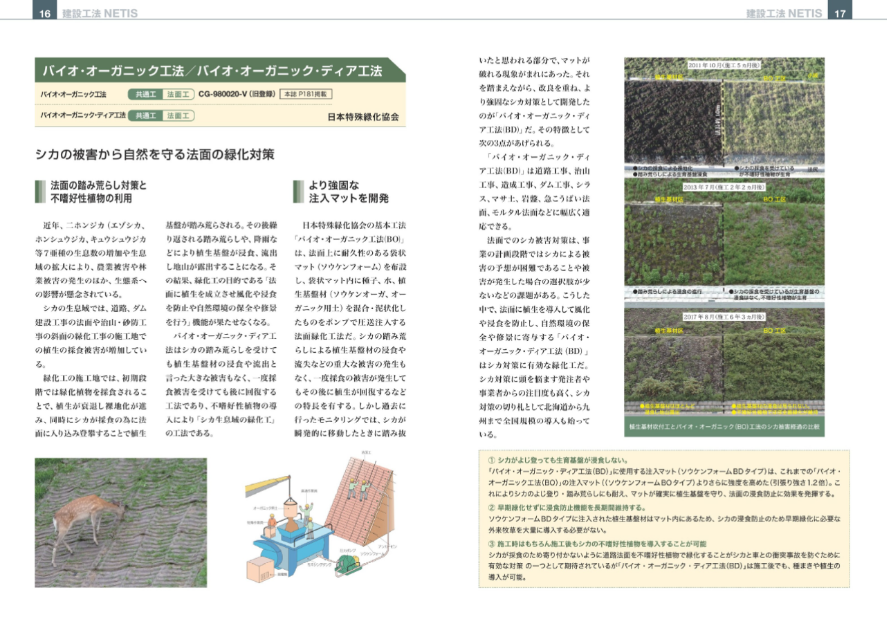 ・袋状のマットに植生基盤を注入することにより、従来の客土吹付工、厚層基材吹付工に比べ植生基盤の耐久性が向上した。また植生基盤材は農学、植物生態学の立場から法面用に研究したものを使用してり、法面上に森林の表土のような環境をつくため、植物の生育が自然に進む。また、汚水汚泥やチップ堆肥を植生基盤材としてリサイクル活用も可能。