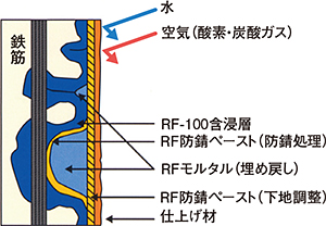 ・物理的改修:「RFモルタル」、「RF防錆ペースト」でコンクリート表面を覆うことにより、水分や炭酸ガスなどの侵入を防ぎ以後の中性化防止と鉄筋の腐食抑制効果を高める