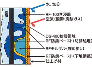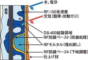 ・化学的改修:中性化したコンクリートの劣化抑制に対しては、「RF-100」によるアルカリ性付与および表面強化を、中性化および塩害によって腐食した鉄筋の防錆に対しては「DS-400」のコンクリート中への拡散・浸透によって鉄筋防錆を行う
