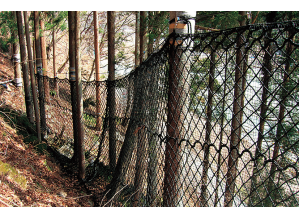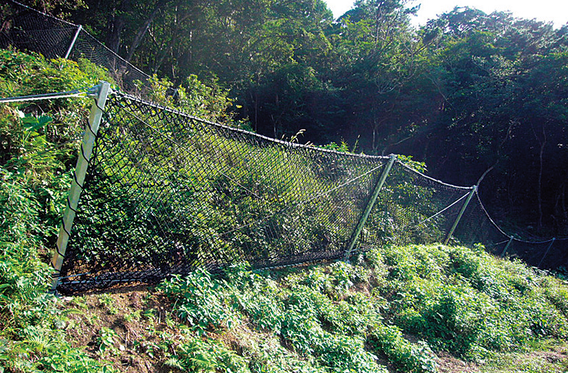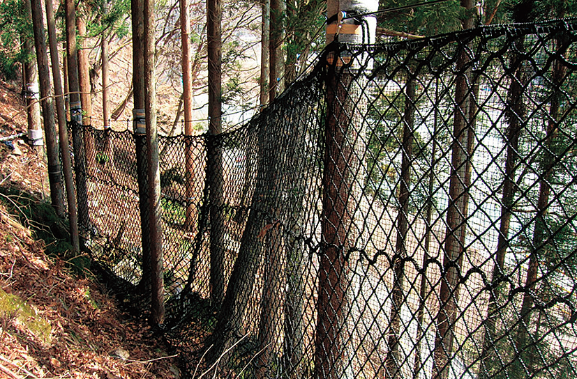 耐水性・耐アルカリ性・耐酸性・耐衝撃性に優れる安価で軽量なポリエチレン製ネット(PEネット)を用いた簡易型落石防護柵。