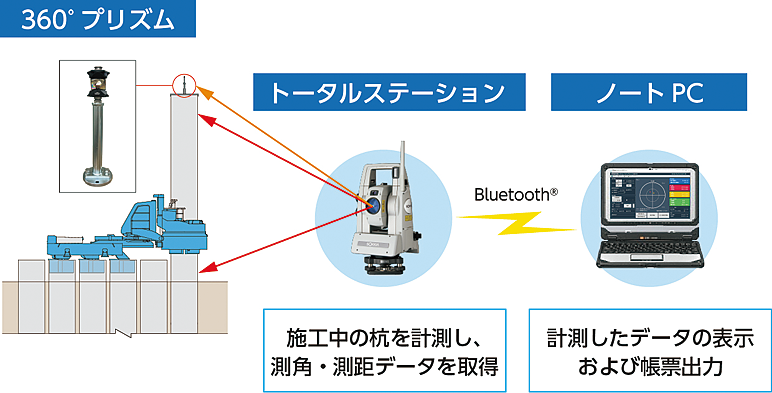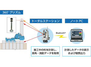 水準器等による鉛直性の確保と、TS(トータルステーション)による手動計測で対応していた品質・出来形管理手法を、TSを用いた圧入機に連動した自動計測によるリアルタイム管理に変えた。