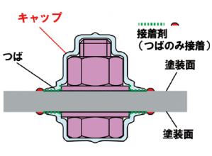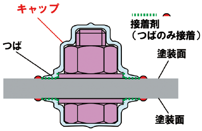 従来の有色ボルトキャップ内に有色接着剤を完全充填する工法から、キャップを透明化し、有色接着剤をキャップつば部のみに塗布して接着する工法に変えた。