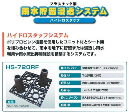 大量の水を一時的に溜めて特殊な枡で少しずつ流出する設備。台風やゲリラ豪雨などの大量の雨水による浸水被害から、街を守る役割を担っている。また、貯留槽に溜まった水は、草木の散水や水洗トイレの水として再利用することも可能。