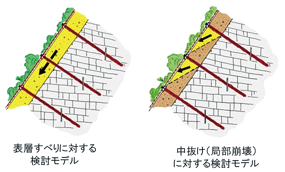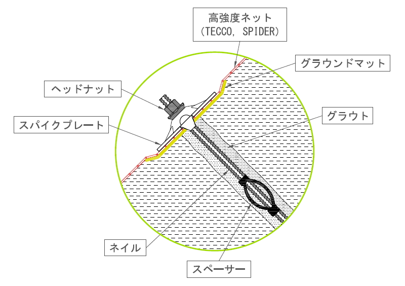 高強度のネット、全ねじ異形棒鋼のネイル、スパイクプレートなどを連結・組み合わせた柔構造を特徴とし、表層崩壊に有効。