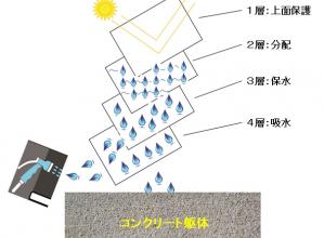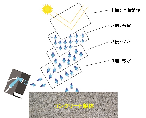 養生シートを4層構造にし、さらに層それぞれが保護層、分配層、保水層、吸水層と異なる機能をもたせた