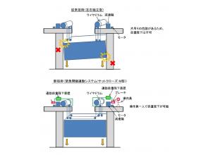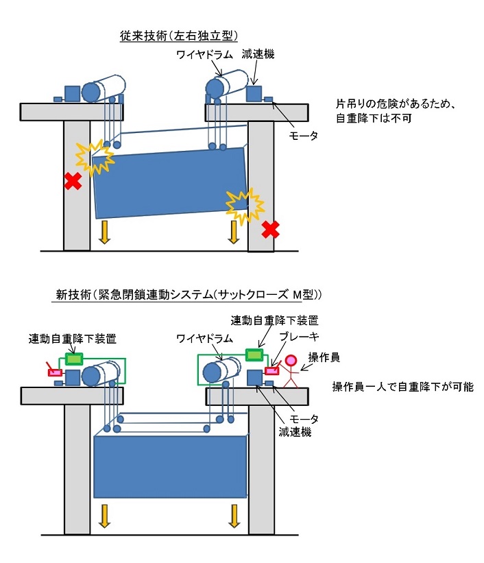 従来技術である2モータ2ドラム式開閉装置に自重降下機能を持たせるための技術である。ダム堰施設技術基準において、高速閉鎖または動力遮断時の閉塞を必要とする水門扉には、自重降下により作動する急降下閉鎖装置を設ける、という記述がある。そのため、従来技術では自重降下機能を要さない施設にのみ適用が可能だったが、新技術ではそれも含めて適用が可能である。