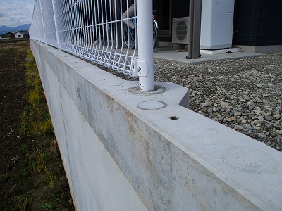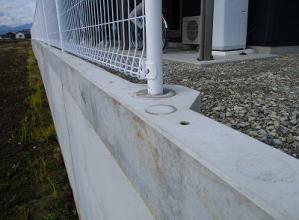 プレキャスト擁壁(主に嵩上げを前提とした、天端にインサートの埋め込まれているL型擁壁)の天端にフェンスロック設置することで、擁壁自体の構造と転落防止柵支柱用の基礎を構築出来る。