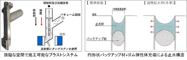 ・伸縮継手鋼板の錆除去をワイヤーブラシ等による3種ケレンから、新たに開発した狭隘な空間で施工可能なブラストシステムによる1種ケレンに変えた。