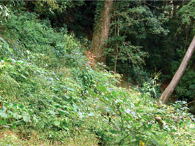 ・自然回復に実績のある「飛来ステーション」と植栽の手間を軽減する「ナエキチ」を組み合わせた、新しい生物多様性保全緑化工。地域の主要構成種を苗木で積極的に導入することで周辺自然環境との調和を図る