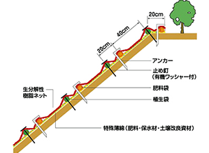 ・主構成材料のネット、特殊薄綿、肥料袋などは分解性の素材を採用。分解速度は現場条件や植生状況などにより異なるが、施工後3~4年程度はネット形状を保つ