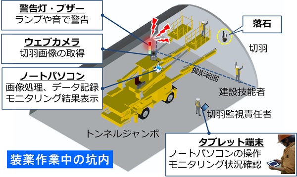 専属切羽監視員の目視のみから、目視にシステムを加えて切羽崩落の予兆となる小片落石を検知(監視)できるシステムに変えた。