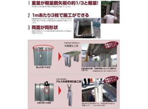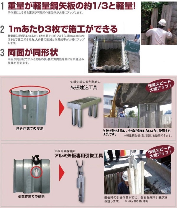 1.矢板材質をアルミ製に変えたことにより、重量が約1/3と軽量になり、手で持ち運びが可能となる。また、防錆性に優れる。
