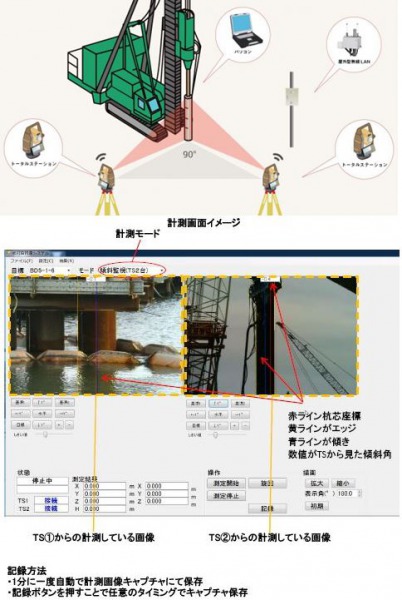 ・デジタルカメラ搭載型トータルステーション(TS)からの画像を、PCのアプリケーションにより、杭打機運転席のオペレーターに杭位置、鉛直度、打設深さを誘導・表示する。