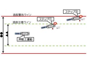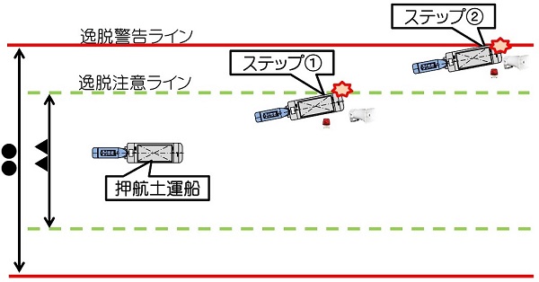 2.経路幅は自由な幅で、二重に設定(ステップ①:逸脱注意ライン、ステップ②:逸脱警告ライン)することが可能であり、経路を逸脱した際は、自動警告(サイレン、ポップアップ、ランプ)され、視覚・聴覚にて注意喚起を行うことができる。