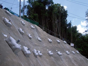 グランドアンカー用反力体として、小型の二次製品受圧板とその荷重を分散させる受圧体との組み合わせにより、現場打ち鉄筋コンクリート受圧板よりも早く、また大型二次製品受圧板よりも廉価に施工できる工法