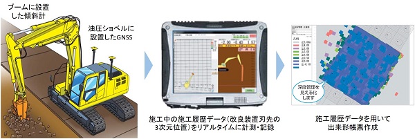 ・改良装置刃先3次元位置情報の取得方法を、レベル・スチールテープを用いた区画割り及び改良深さ管理から、油圧ショベルに設置したGNSS受信機またはTSと、ブーム等に設置した傾斜計による自動計測に変えた。
