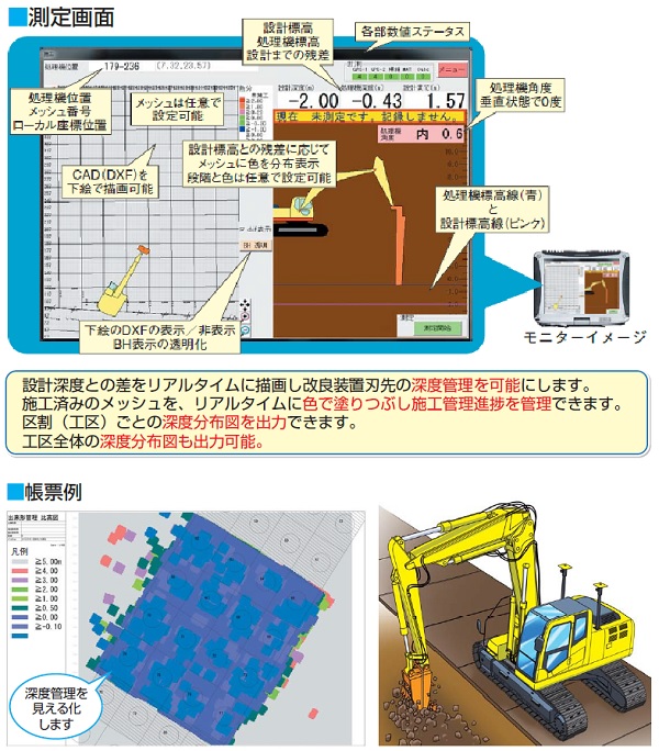 ・改良装置刃先3次元位置情報の取得方法を自動計測に変えたことにより、設計深度との差をリアルタイムに描画し、改良刃先装置の深度管理、確実な施工管理が可能となる。