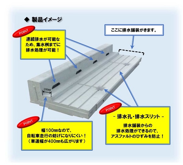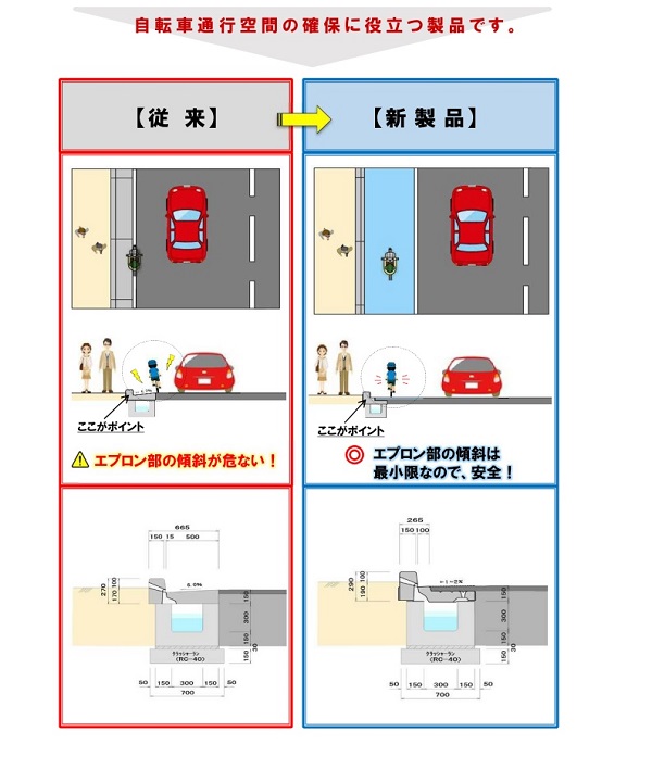・エプロン部が100mmと短く、横断勾配を一定とすることができる。また、暗渠であるため、集水枡蓋も従来より小型となり、自転車の転倒防止に繋がるため、安全性が向上。