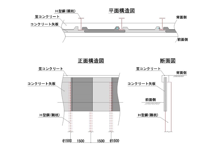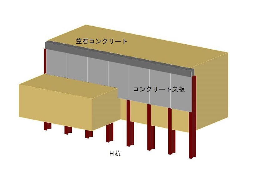 土留壁をコンクリート矢板の単体構造から、H杭とコンクリート矢板の複合構造に変えた。