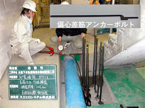 ◇新技術イナズマアンカーは干渉の発生した箇所に適用され、偏心を利用して"コンクリート埋込部穴"を設け、イナズマアンカと接着固定する。干渉の発生しない箇所はストレートアンカーを使用。当初の基礎配置図の変更なしに施工可能。従来方式の②~④を省略できる。また、従来方式で寸法の制約などにより中間板が適用できない場合、干渉位置のコンクリートを斫りアンカー位置修正作業が要求される場合もあるが、新技術アンカーでは斫りなしで施工可能となる。