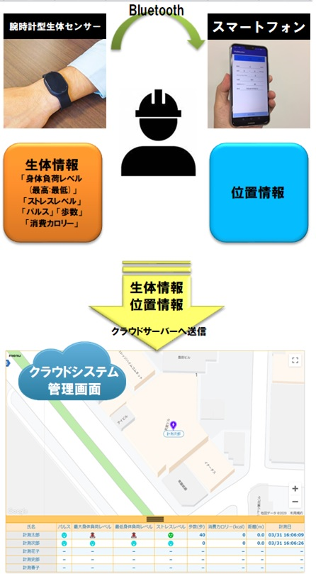 作業員自身の健康管理と監視員による入場時のチェックから、腕時計型生体センサーとスマートフォンを使用し、生体情報と位置情報をWEB上で閲覧および管理するシステムに変えた。