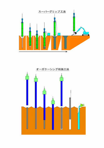・ケーシングによる既存杭外周の掘削及びケーシング引抜後に、玉掛けワイヤーにより既存杭を引抜いていたものを、掘削用ケーシングに既存杭を内包したまま引抜くようにした。