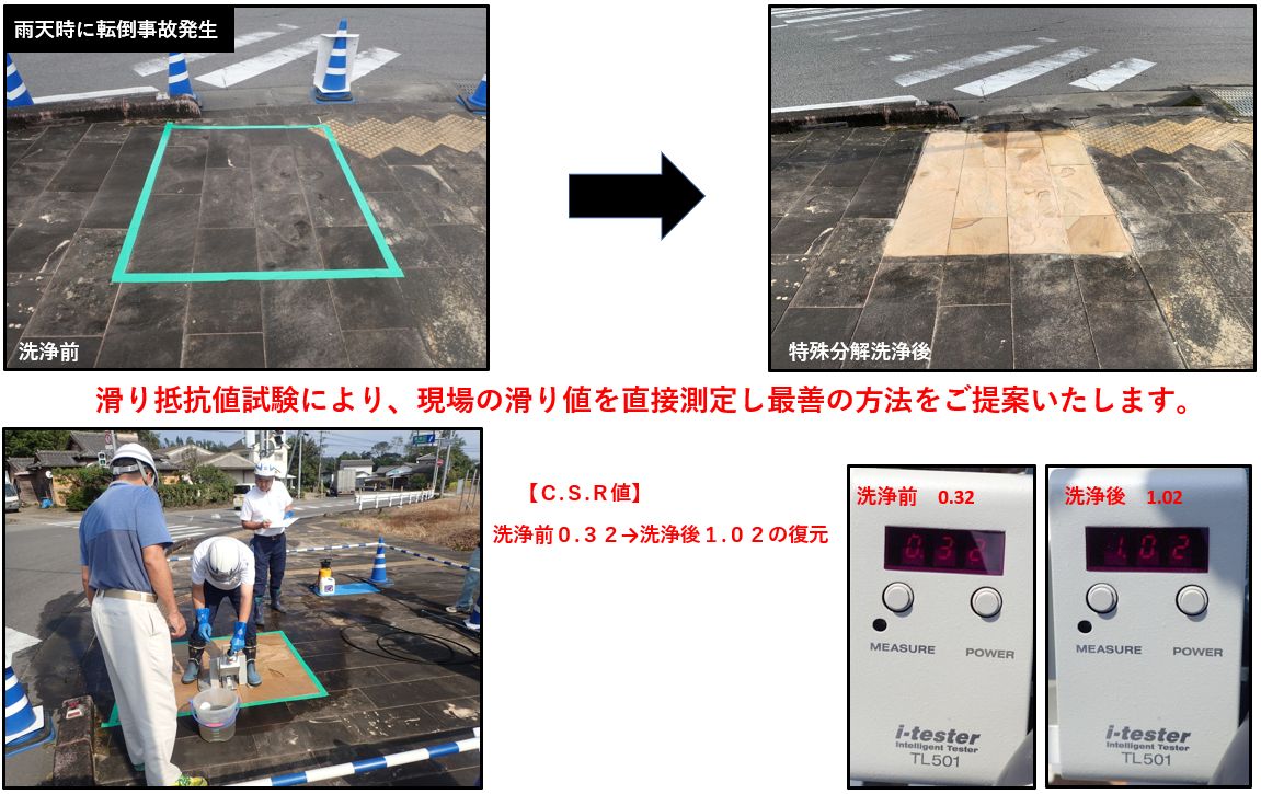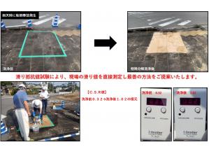 ・従来の高圧洗浄工法では表面のみの洗浄で、カビ・菌類の根絶はできず、すぐに再発することが課題であった。特殊分解洗浄工法により、核から根絶するため、防カビ効果を発揮。安全性(滑り抵抗値維持)及び美観の長期維持が期待できる。
