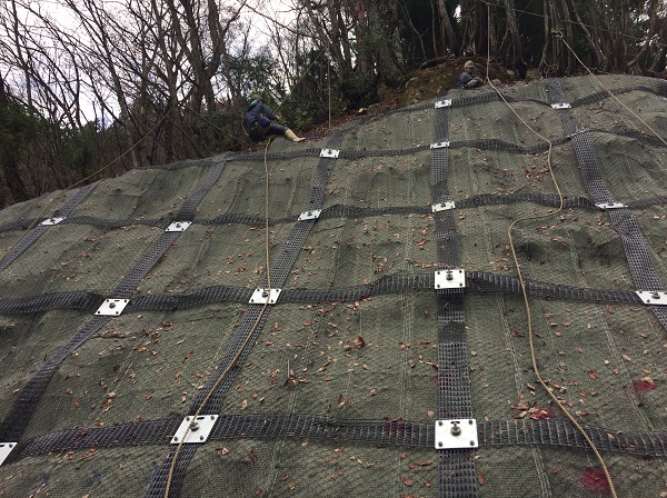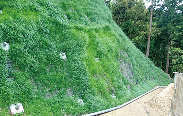 モルタルおよびコンクリートを使用した法枠工から帯状法面材を使用した法面(斜面)安定化工法に変えた。