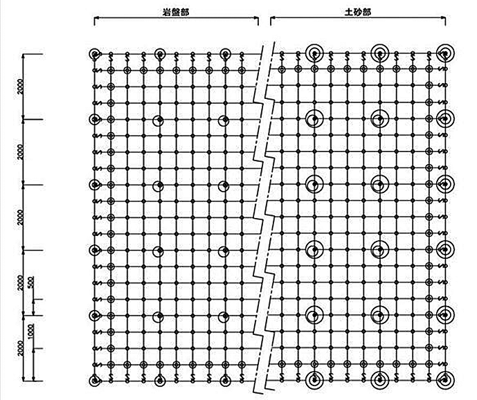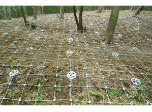 ・コンクリート法枠の代わりにロックボルトに締結した格子状のワイヤロープの抑止力・支持力により落石を予防する。