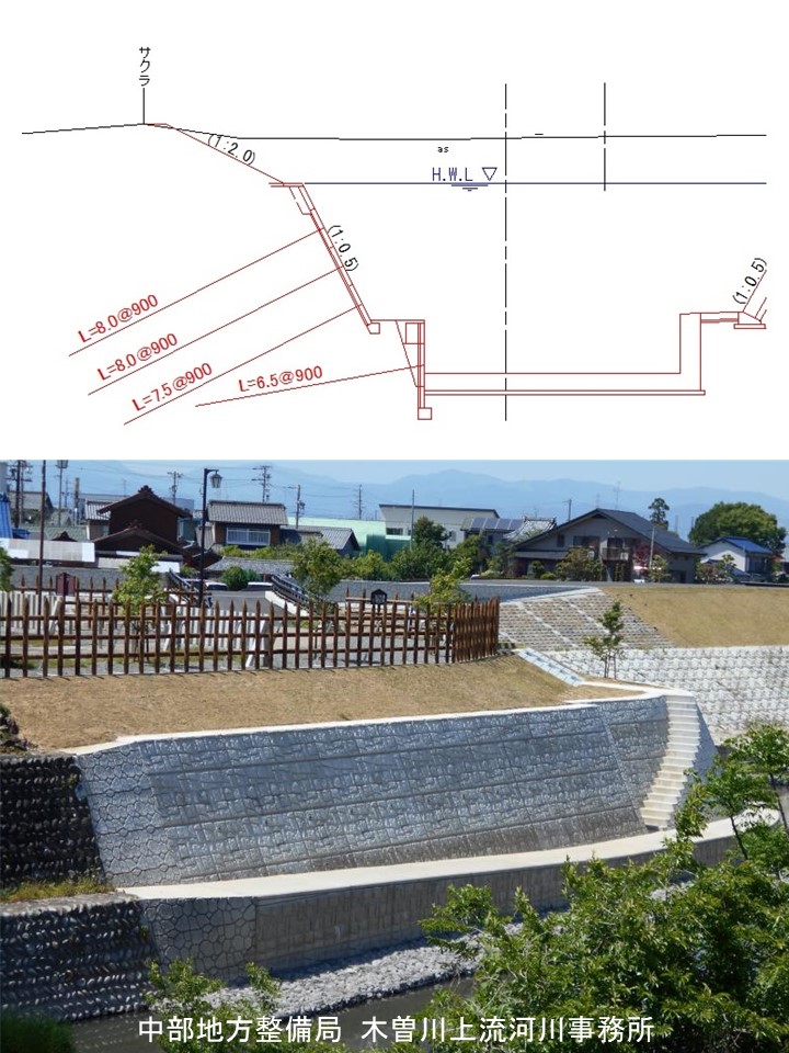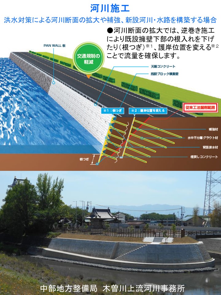計画護岸の上部や背面に道路や家屋などの制約があり、掘削が困難な場合の護岸新設や護岸改修工事では、従来は仮設土留めを行い、構造物掘削を行った後に大型ブロック積み擁壁等が施工されていた。新技術では、表面工に高強度のプレキャストコンクリートパネル、補強材には高品質の水中不分離グラウトやガラス繊維強化プラスチックを使用し、安全な逆巻き施工によって、従来の仮設土留めと構造物掘削を行わずに護岸新設や護岸改修ができる。