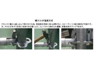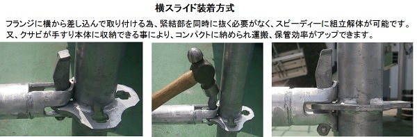 ・クサビが手すり本体に収納できる事により、従来より運搬時、保管時のスペースをとらないため、積載運搬効率、保管効率がアップする。