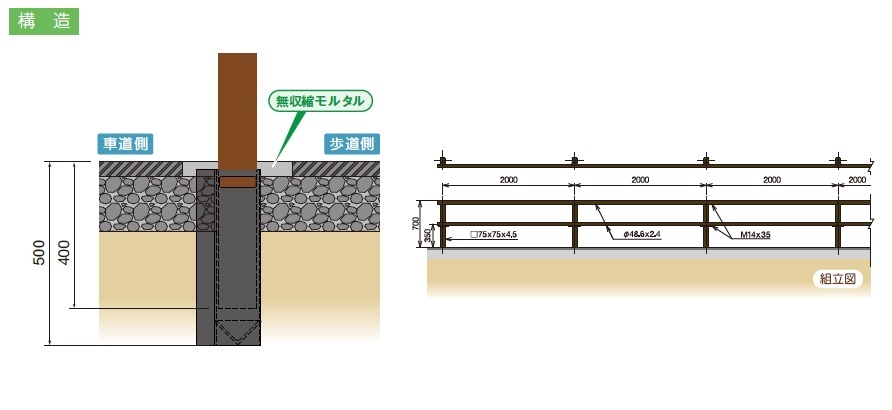 ・重機が不要でガードレール支柱打込機で施工でき、床掘り・埋戻しも不要となり、また、狭い幅員の歩道や埋設物の多い市街地にも適用できるため、施工性の向上が図れる。