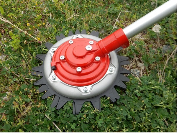 従来は刈刃を高速回転させ草を刈るのに対し、本技術は減速機構を採用しエンジン回転数の1/20に減速し、上刃、下刃を互いに逆方向に回転させ、草木をハサミ切る方式になる。