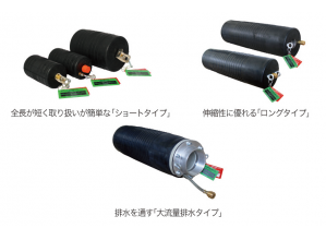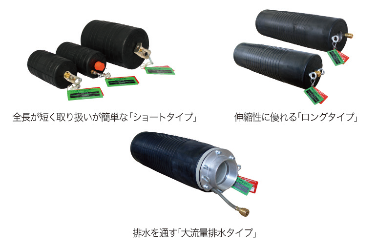 ・材質をSBR合成ゴムにしたことにより、耐久性に優れ、ロングタイプおよび大流量排水タイプは強化繊維で補強したことにより、伸縮性にも優れる。