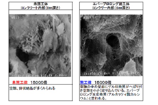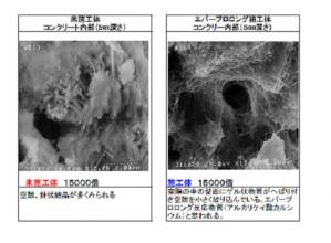 ・均質でナノレベルの小さな粒径のけい酸塩粒子に変えたことにより、含浸性が高まった。また、ナトリウムとカリウム混合(モル比1:1)に変えたことにより、水和反応が遅くなり更に含浸性が向上し、保護層が厚くなり(従来技術は1mm、本技術は5mm程度)、コンクリート構造物の耐久性が向上する。