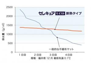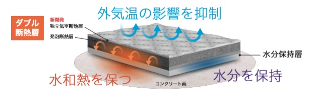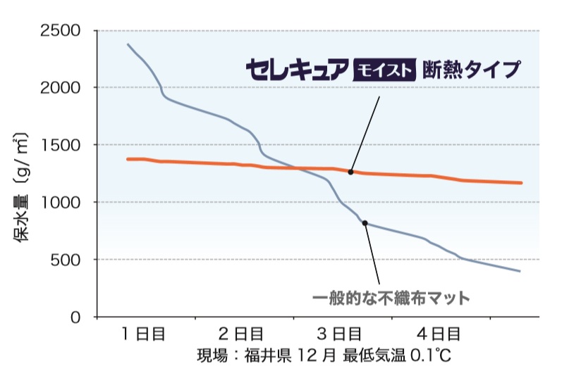 保水材と断熱材との複合構造に変えたことにより、ブルーシート敷設が省略できるため、省力化及び工程の短縮が図れる。