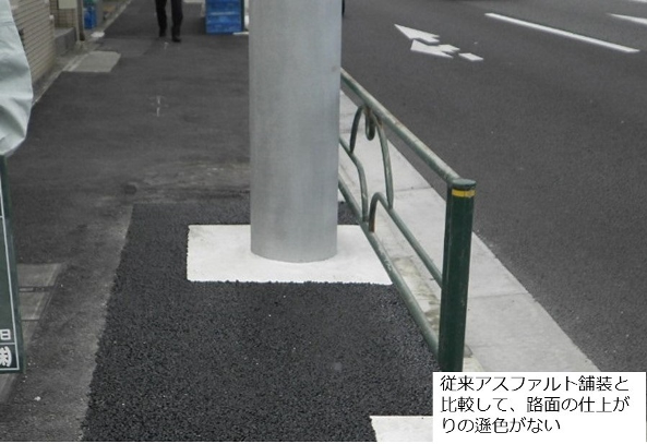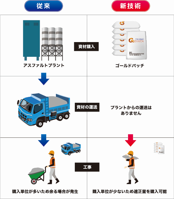 従来はプラント加熱合材(1バッチ購入)。本技術は加熱アスファルト合材を冷却し袋詰めすることで、現場に必要な数量分だけ持ち込み施工できる。