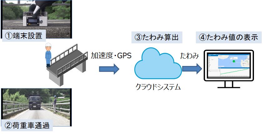 ・計測データの整理において、データ記録装置(データロガー等)から計測データを抜き出し、計測対象橋梁と対応付ける人手作業から、計測機器にGPS情報を使って地図上の計測橋梁と計測データをセットでクラウド上に自動保存する仕組みに変えた。