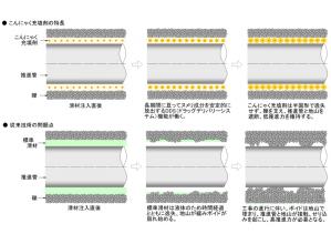 液状からヌメリ成分を備えたゲル状の滑材に変えたことにより、摩擦力の低下、滑材の残存率が向上する。このため新技術の使用量は、従来技術の使用量の約95%を削減することが可能となり、材料保管スペースの軽減に繋がる。また、材料コスト削減による経済性の向上が期待される。